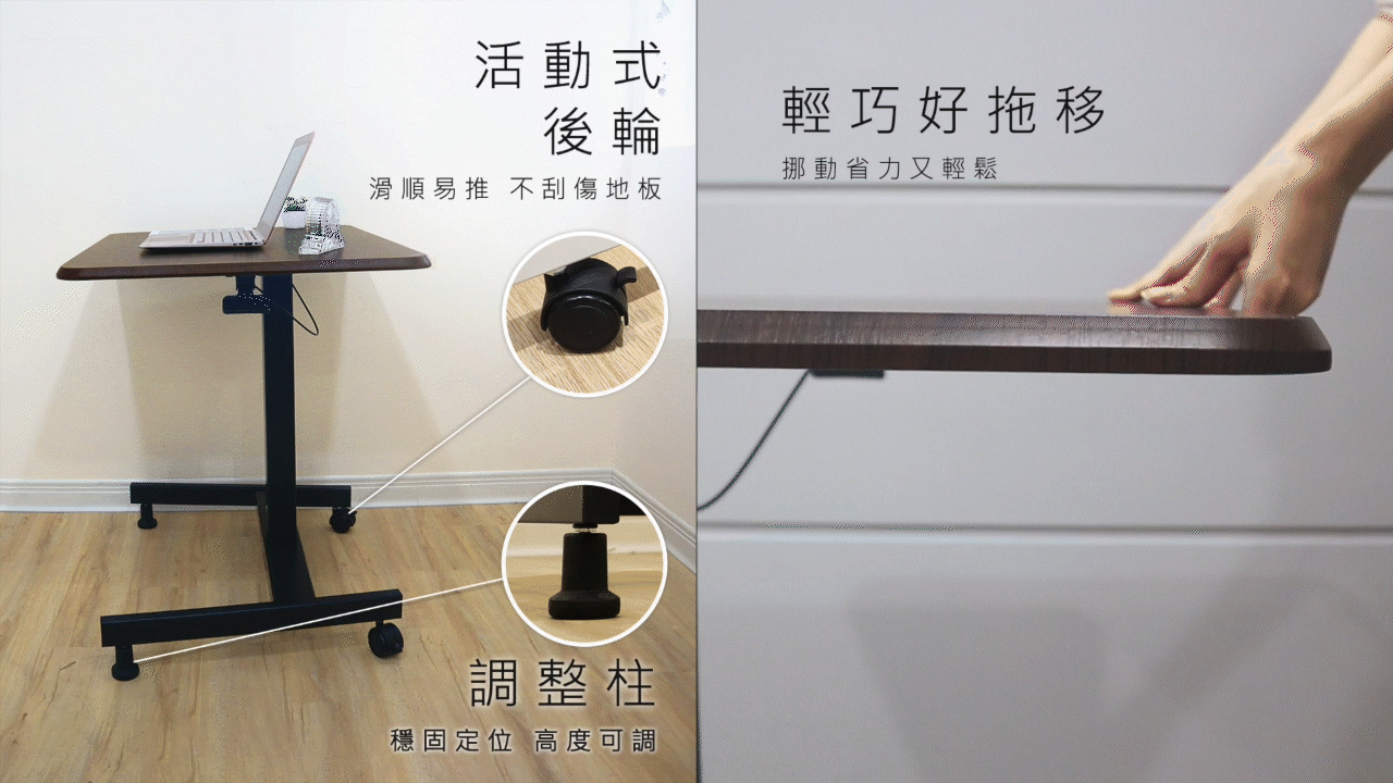 活動式後輪 : 360度自由旋轉、任意位移,含有固定用的小結構,減緩桌子移動的可能