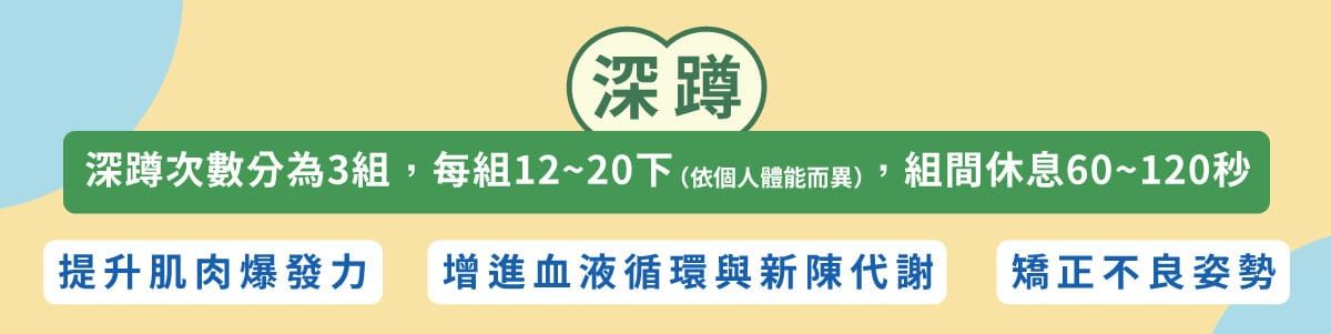 深蹲次數分為3組,每組12~20下,組間休息60~120秒